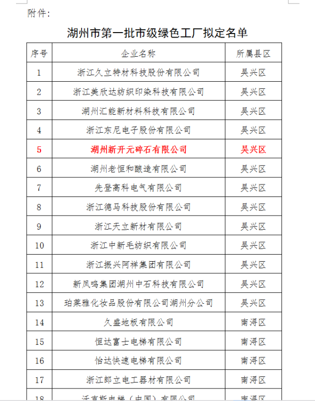 新開元作為湖州市生態(tài)文明標準化示范點單位,致力于打造“花園式”礦山,成為了廠區(qū)如景區(qū)的現(xiàn)代化工廠,公司入選為湖州市第一批市級綠色工廠。